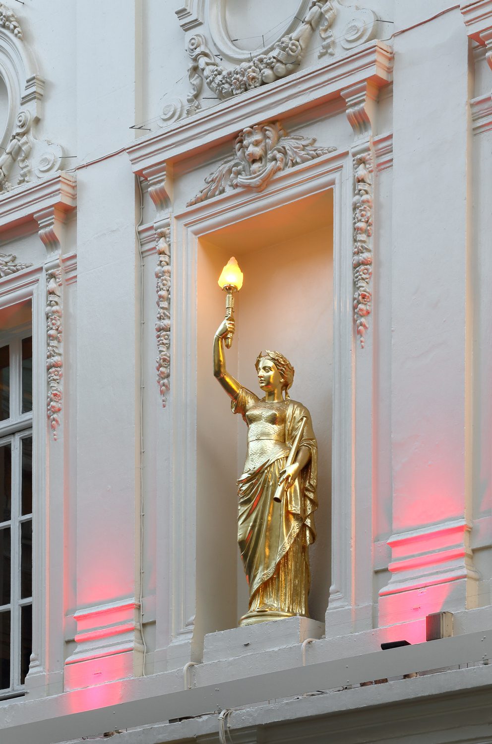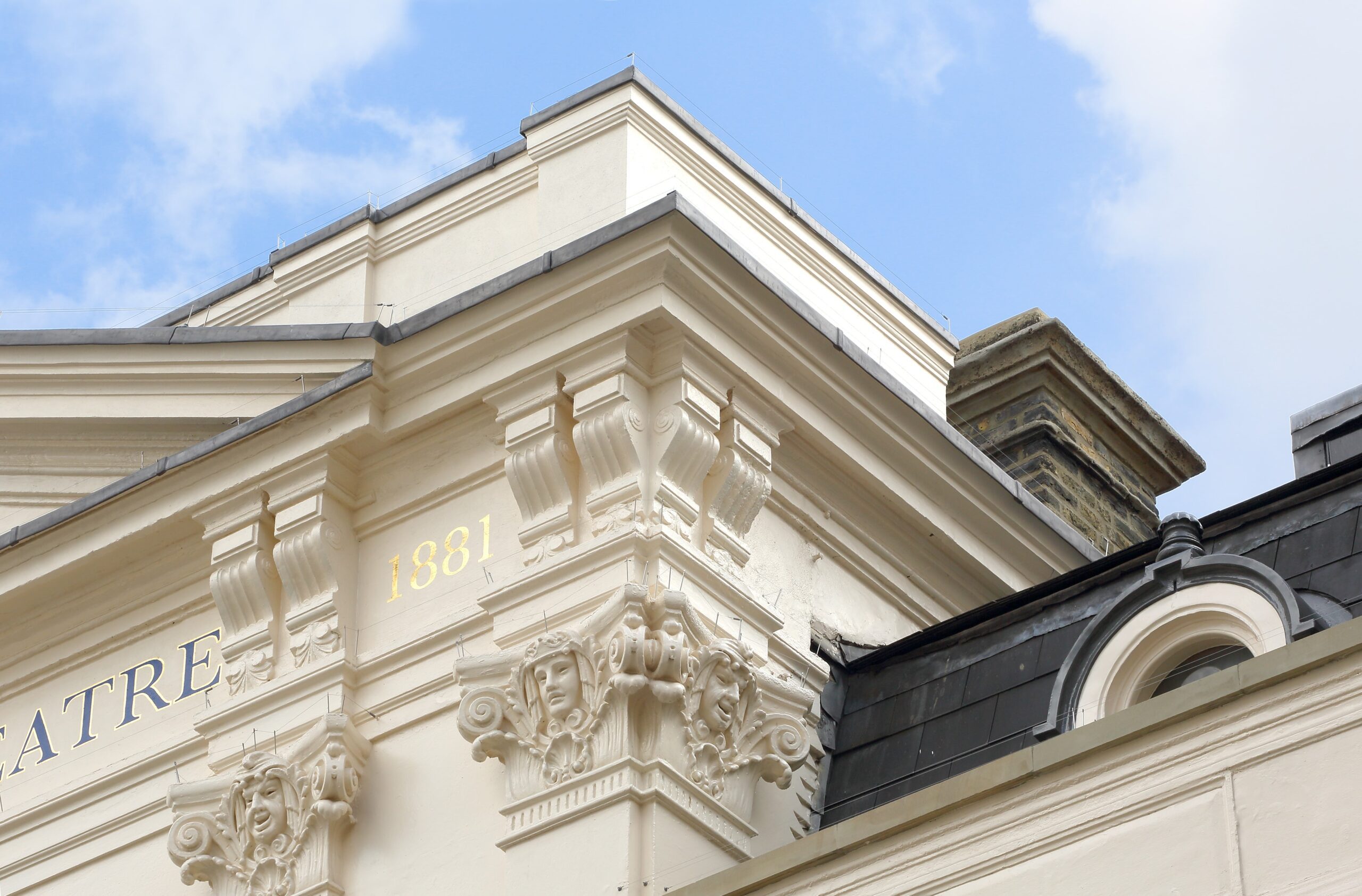 The entire cornice detail was reformed in lime mortar and missing stucco detailing reinstated and structural repairs completed. The statue “Arts and Music” was re-gilded back to its former glory.