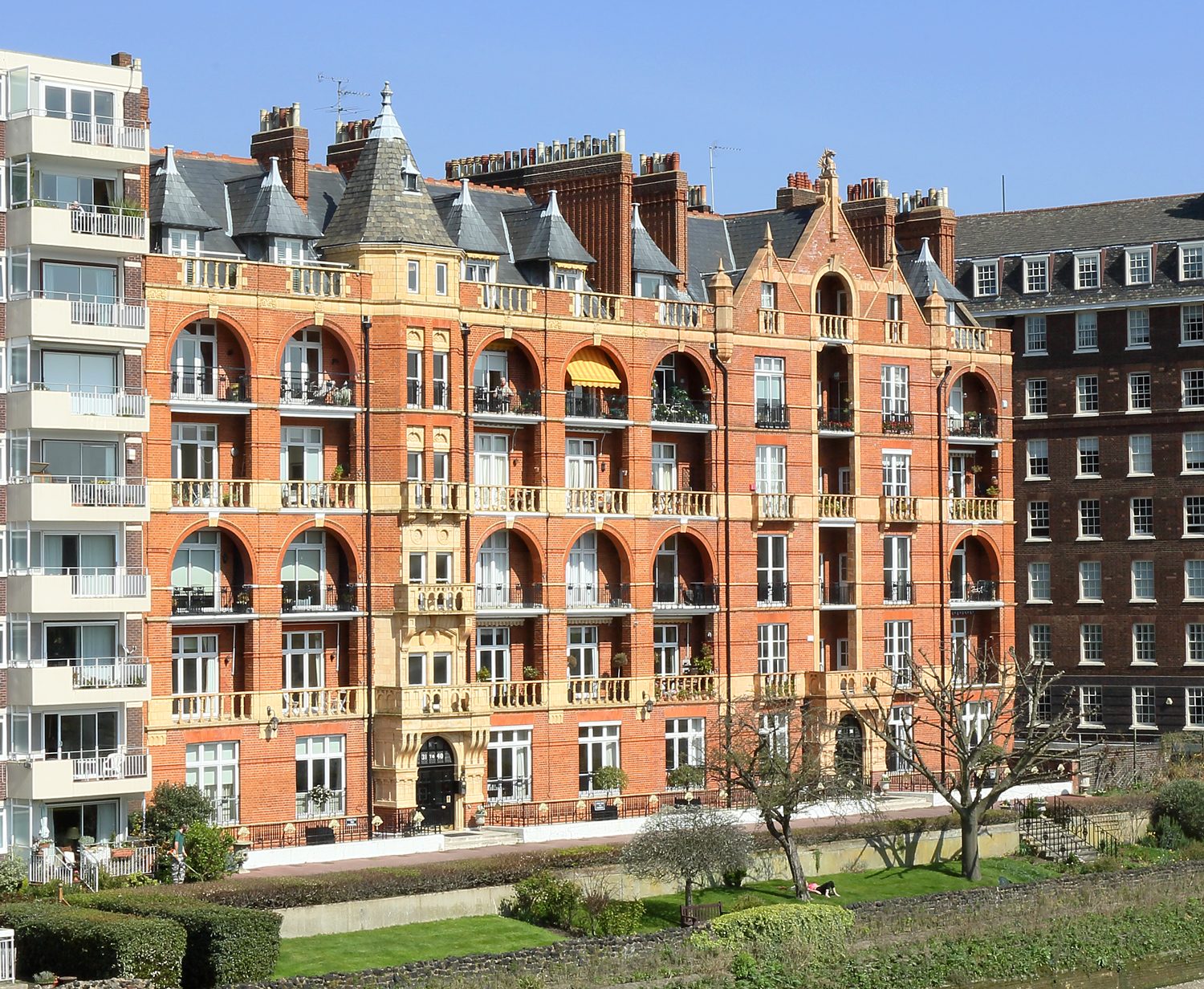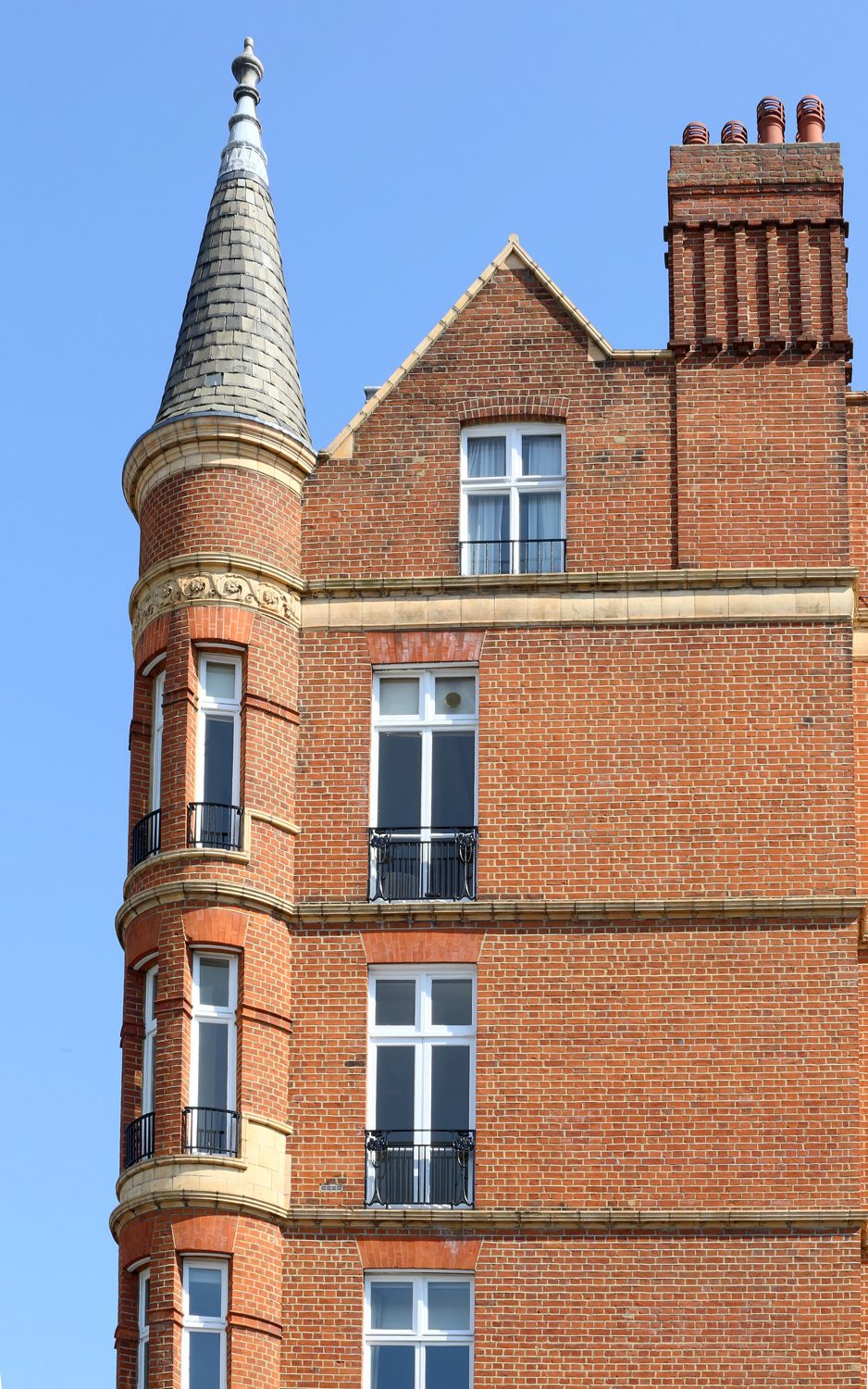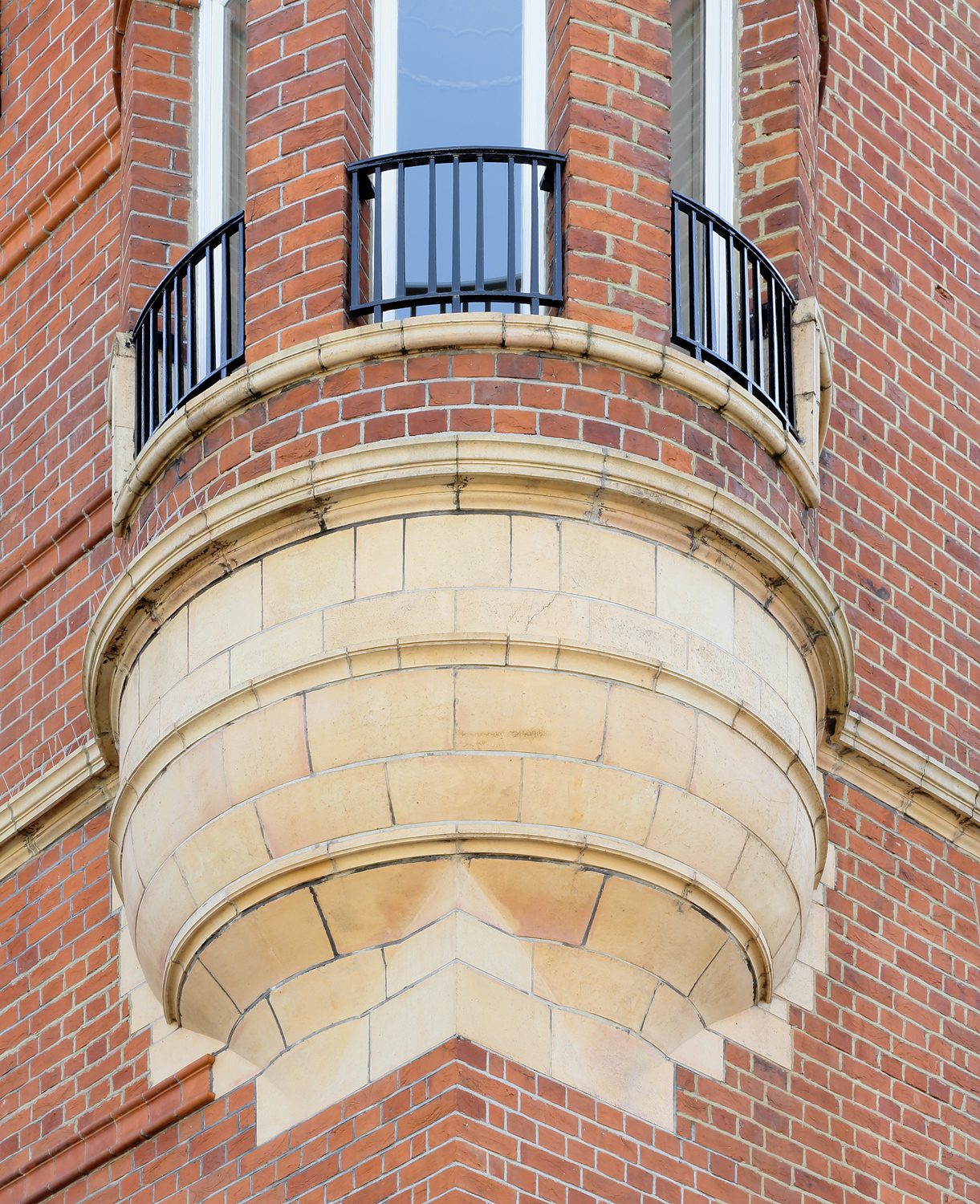 Once all brickwork and terracotta dressings had been sensitively cleaned, severe damage to the balconies and porticos was evident to both the front and rear of the building. Investigatory works established that this was due to the rusting of the hidden structural steel frames. After all the defective elements were treated or replaced with stainless steel, terracotta blocks were replaced with matching units as necessary, including moulded sections to the high level riverside gables.