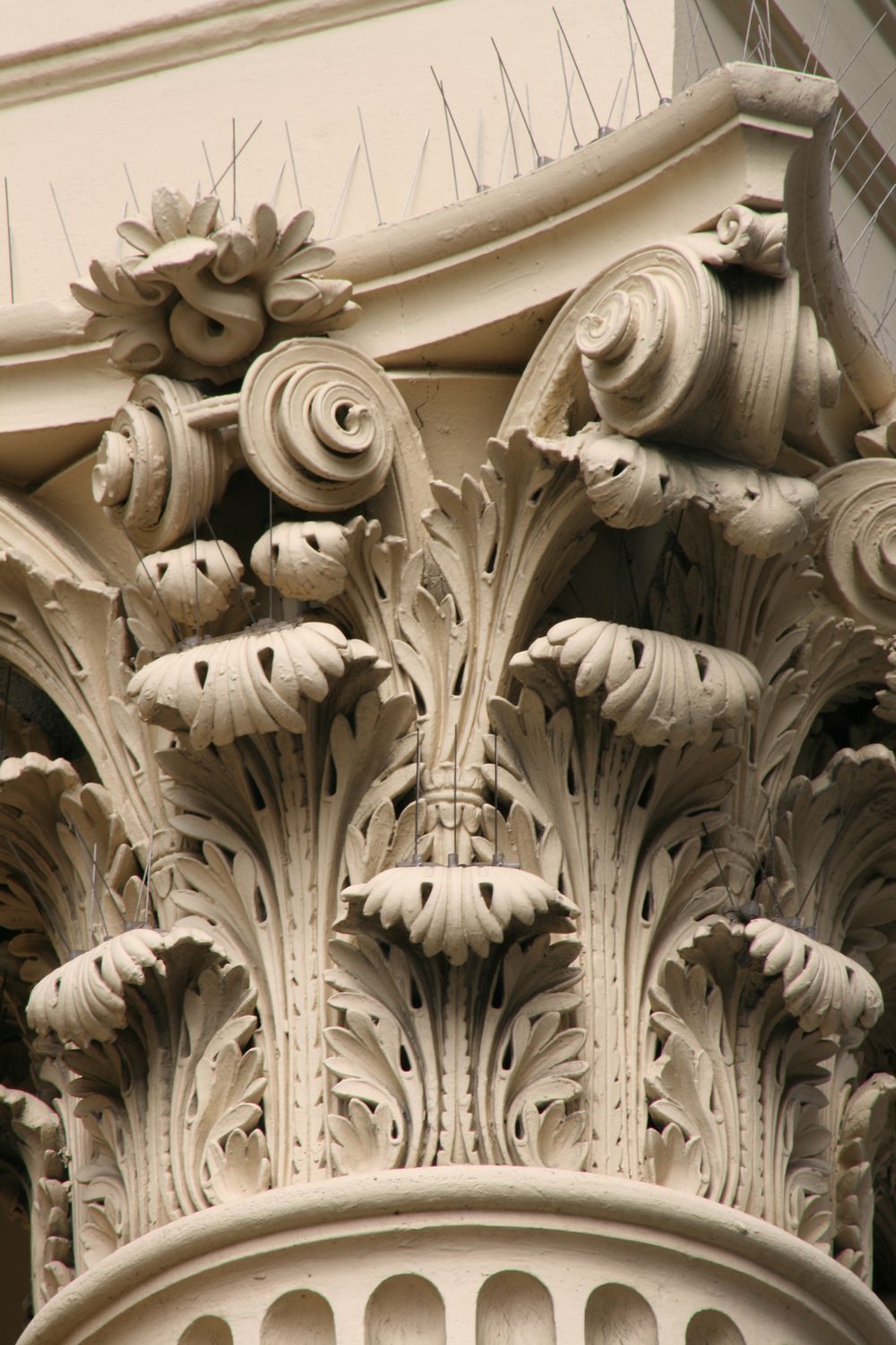The stucco façade and parapet displayed distinct signs of deterioration, confirmed by hammer testing. The first task in restoring this building was to remove numerous thick layers of paint to establish the extent of disrepair. The brickwork was in an extremely advanced state of decay with a number of sections needing to be rebuilt. Plain stucco were hacked off and reinstated with three coats of progressively weakening lime mortar and moulded details.
